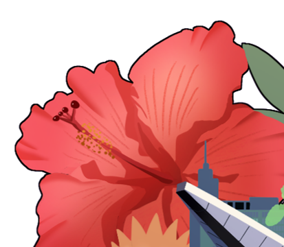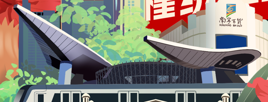 南宁印象系列立牌的背景设计中,地铁列车穿行于城市的标志性建筑物与南宁市的市花朱槿花之间,体现轨道交通与城市发展的紧密联系。以下是对背景中除地铁列车外的要素的介绍。
