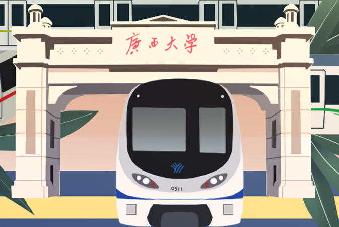 广西大学校门 *穿行在大门中的列车为南宁轨道交通五号线列车 |
